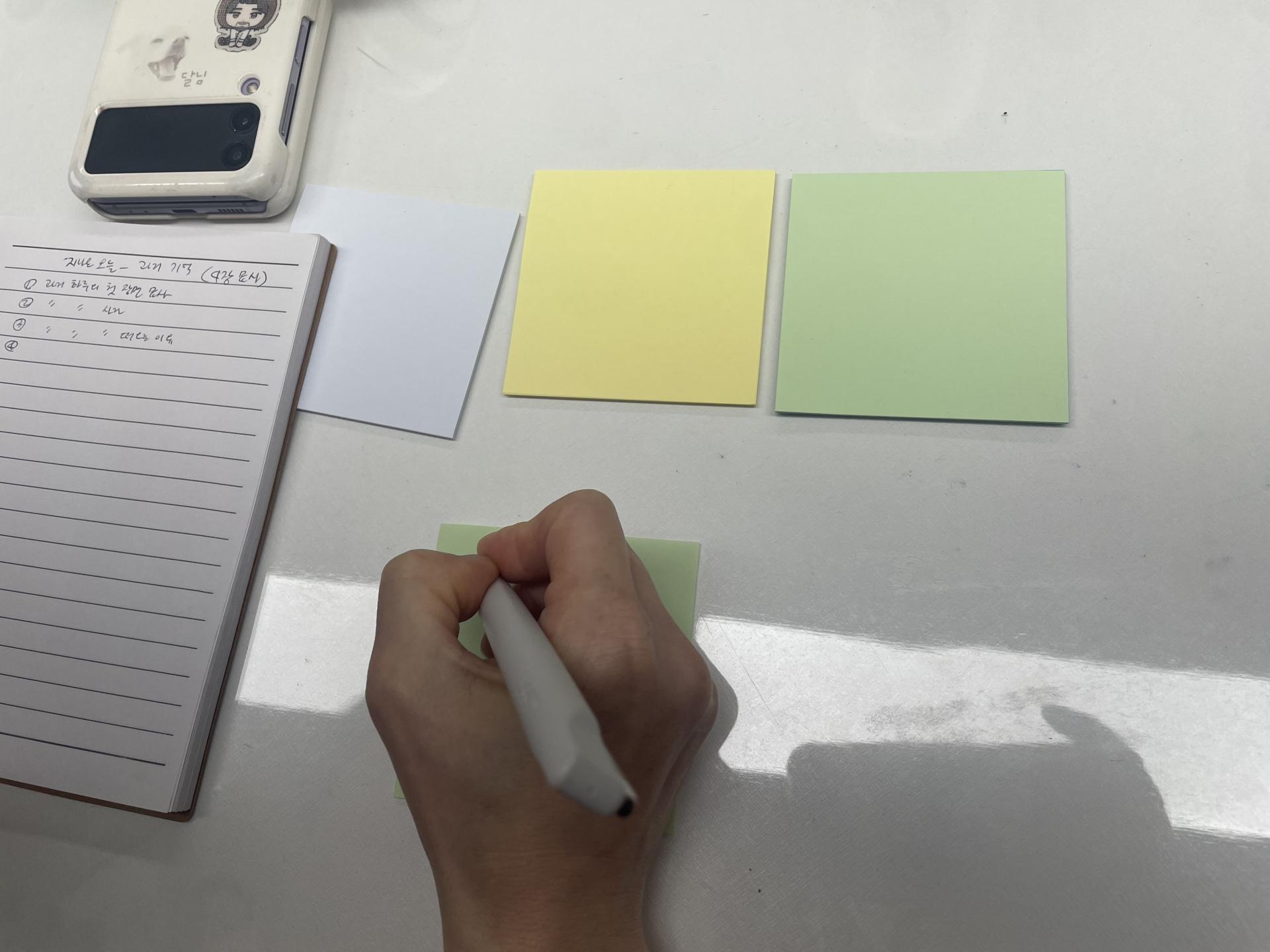포스트잇을 준비하고 5분동안 타이머를 맞추고 계속 씁니다. 발걸음을 멈추지 않는 것처럼 펜을 움직혀 글을 써봅니다. 어릴적 자매들이 모여 앉아 종이인형 놀이를 했던 기억, 어릴적 가족들이 둘러앉아 밥을 먹던 장면, 출산 후 병실에서 눈을 떴을 때의 기억, 할머니와 함께 살았던 기억, 남편을 처음 만났을 때의 기억… 지나온 오늘의 장면들이 생생하게 글로 쓰여집니다.