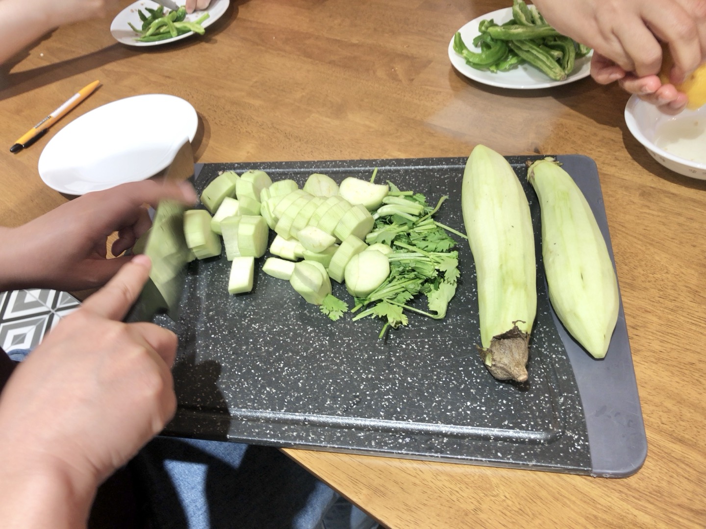 5๋ช ์ฉ ํ ํ์ด ๋์ด ์ฌ๋ฃ๋ฅผ ์๋ฅด๊ณ , ์ฐ๊ณ , ์๊ณ , ๊ฐ์์ ๋ฅ์ ์์ฑํ์ด์.